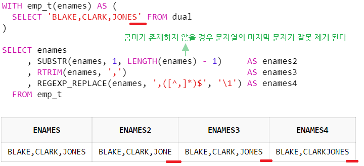 SUBSTR 함수를 사용하여 마지막 문자를 제거할 경우 해당 문자가 존재하지 않으면 문자열의 마지막 문제가 잘못 제거될 수 있다. RTRIM, REGEXP_REPLACE 함수는 마지막 문자가 존재하지 않을 경우 아무런 제거 작업을 수행하지 않는다. 문자열의 마지막 문자가 존재하지 않을 수 있다면 RTRIM, REGEXP_REPLACE 함수를 사용할 것을 권장한다.