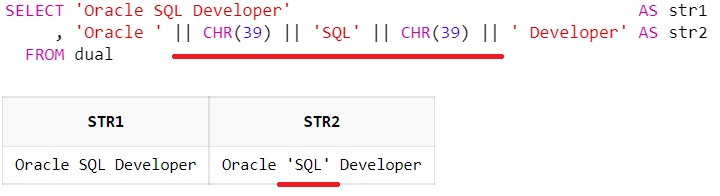 , 'Oracle ' || CHR(39) || 'SQL' || CHR(39) || ' Developer' AS str2