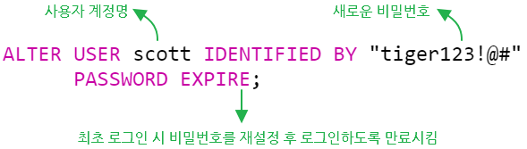 ALTER USER scott IDENTIFIED BY tiger123 PASSWORD EXPIRE;