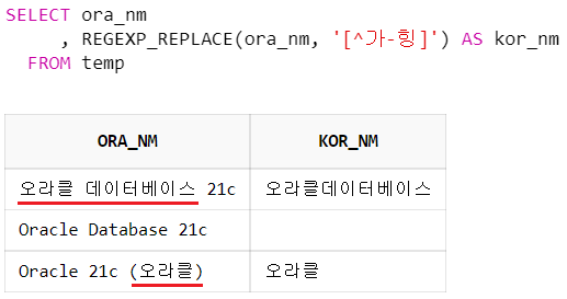 , REGEXP_REPLACE(ora_nm, '[^가-힝]') AS kor_nm