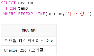 WHERE REGEXP_LIKE(ora_nm, '[가-힝]'