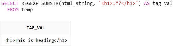 SELECT REGEXP_SUBSTR(html_string, '<h1>.*?</h1>') AS tag_val