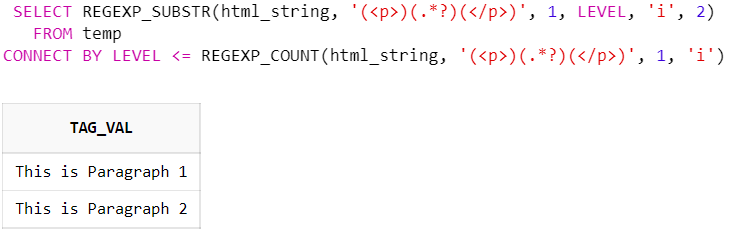 SELECT REGEXP_SUBSTR(html_string, '(<p>)(.*?)(</p>)', 1, LEVEL, 'i', 2) AS tag_val