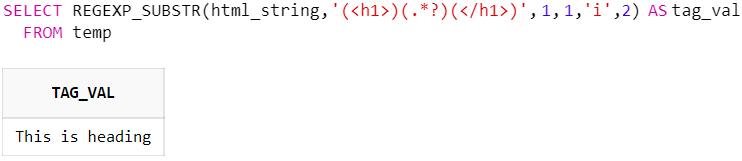 SELECT REGEXP_SUBSTR(html_string, '(<h1>)(.*?)(</h1>)', 1, 1, 'i', 2) AS tag_val