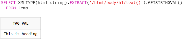SELECT XMLTYPE(html_string).EXTRACT('/html/body/h1/text()').GETSTRINGVAL() AS tag_val