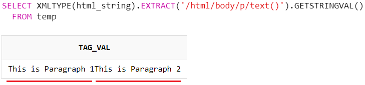 SELECT XMLTYPE(html_string).EXTRACT('/html/body/p/text()').GETSTRINGVAL() AS tag_val