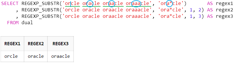 SELECT REGEXP_SUBSTR('orcle oracle oraacle oraaacle', 'ora*cle') AS regex1