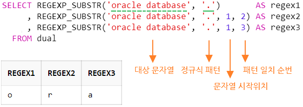 , REGEXP_SUBSTR('oracle database', '.', 1, 3) AS regex3
