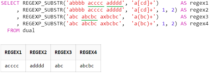 , REGEXP_SUBSTR('oracle database', '[a-c]', 1, 2) AS regex2