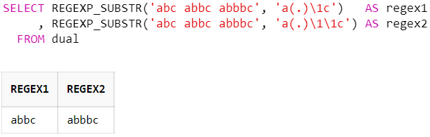 SELECT REGEXP_SUBSTR('abc abbc abbbc', 'a(.)\1c') AS regex1