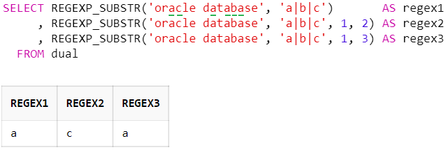 SELECT REGEXP_SUBSTR('oracle database', 'a|b|c') AS regex1