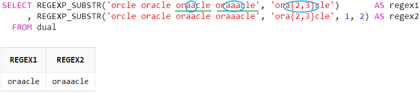 , REGEXP_SUBSTR('orcle oracle oraacle oraaacle', 'ora{2,3}cle', 1, 2) AS regex2