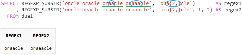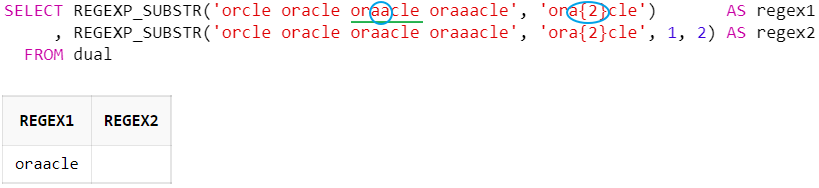 , REGEXP_SUBSTR('orcle oracle oraacle oraaacle', 'ora{2}cle', 1, 2) AS regex2