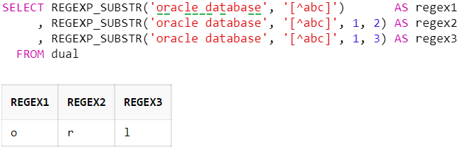 , REGEXP_SUBSTR('oracle database', '[^abc]', 1, 3) AS regex3