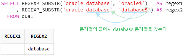 , REGEXP_SUBSTR('oracle database', 'database$') AS regex2