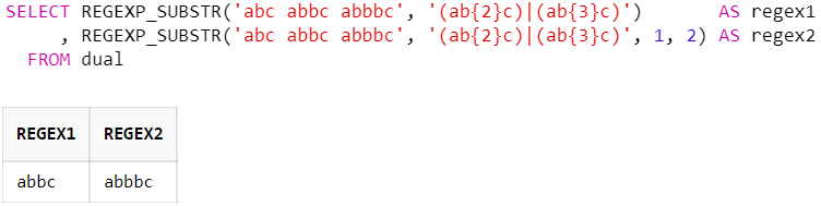 , REGEXP_SUBSTR('abc abbc abbbc', '(ab{2}c)|(ab{3}c)', 1, 2) AS regex2