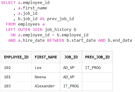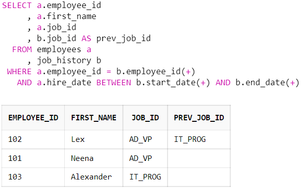 AND a.hire_date BETWEEN b.start_date(+) AND b.end_date(+)