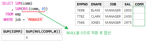 , SUM(NVL(comm, 0)) --SUM 함수 내부에 NVL 사용