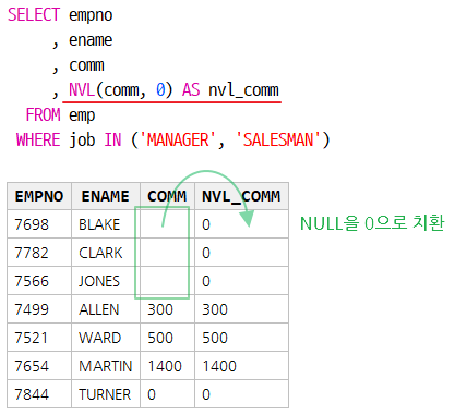 , NVL(NULL, 0) --NULL을 0으로 치환