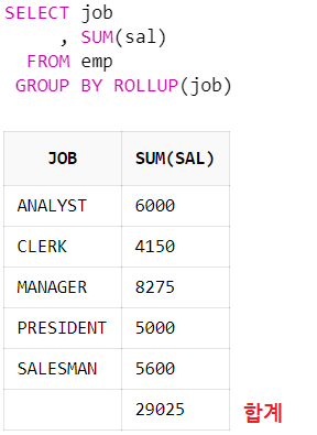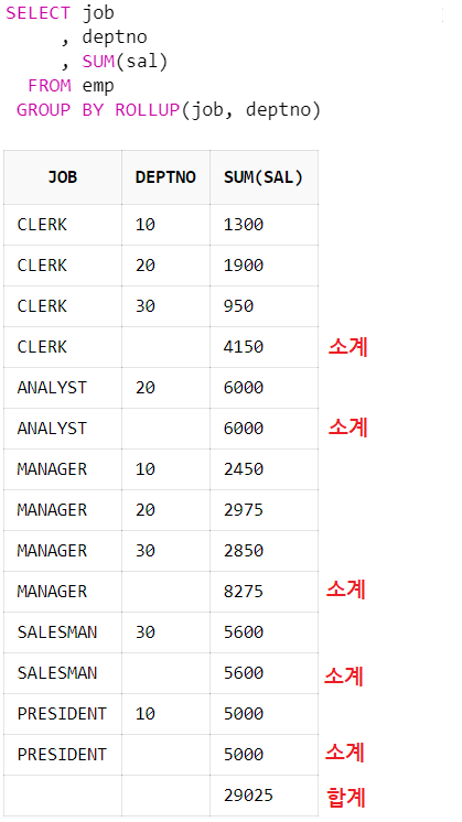 - GROUP BY 절에 ROLLUP 함수를 추가한 후 그룹핑 컴럼을 인자로 넣는다
