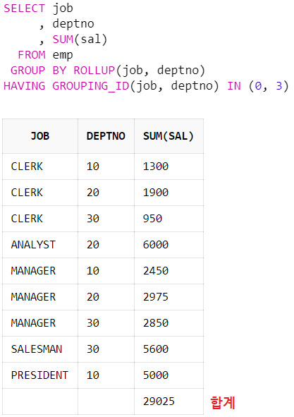 - HAVING 절에 GROUPING_ID 함수를 이용하여 소계 값을 제외할 수 있다