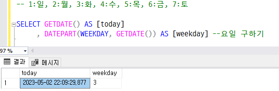 , DATEPART(WEEKDAY, GETDATE()) AS [weekday2] --숫자 요일 구하기