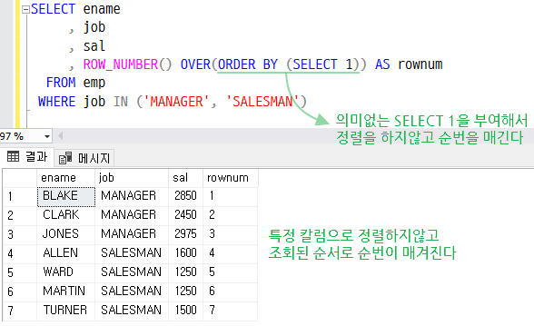 정렬 기준을 부여하지 않고 순번을 매기기 위해서는 ORDER BY 절에 SELECT 1과 같은 의미 없는 값을 부여하여 원 데이터가 조회된 기준으로 순번을 매길 수 있다.