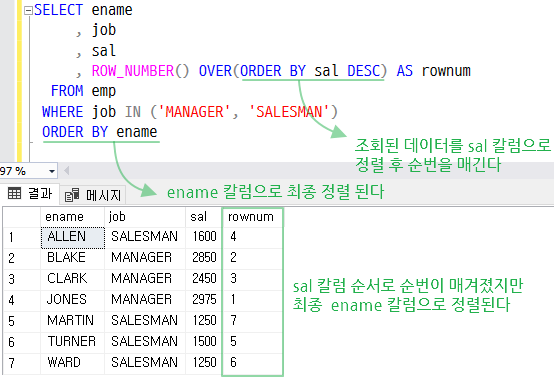 위의 예시는 OVER 절 내부의 ORDER BY 절 기준으로 정렬 후 순번을 매겨졌지만, SELECT 절에 ORDER BY 절의 ename 칼럼으로 다시 정렬되었기 때문에 순번 순서로 조회되지 않는다.