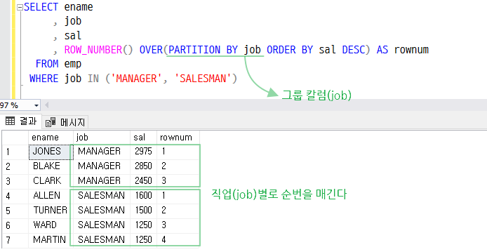 , ROW_NUMBER() OVER(PARTITION BY job ORDER BY sal DESC) AS rownum