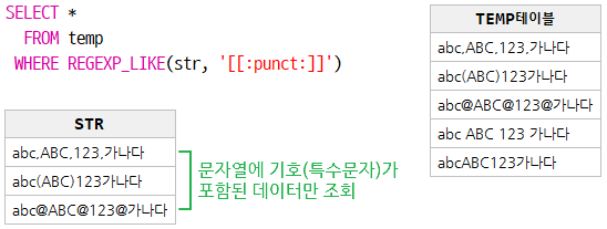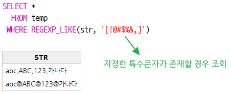 정규식 함수 (REGEXP_LIKE)를 사용하여 문자열에 특수문자가 포함되었는지 검색할 수 있다.