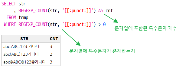 WHERE REGEXP_COUNT(str, '[[:punct:]]') > 0