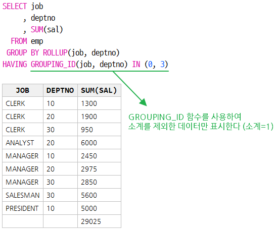 HAVING GROUPING_ID(job, deptno) IN (0, 3)