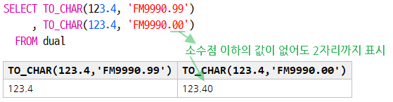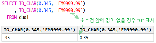 TO_CHAR(0.345, 'FM9990.99') : 소수점을 반올림하여 2자리 까지 표시 ( 0.345 → 0.35 )
