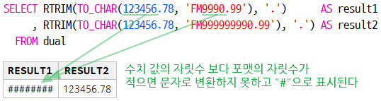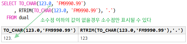 | RTRIM(TO_CHAR("수치 값", "포맷"), '.') 예) RTRIM(TO_CHAR(123.456, 'FM9990.99'), '.') |