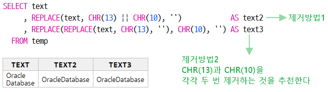 그러나 특정 OS나 프로그램에 따라서 CHR(10) 하나의 값으로 엔터 값이 입력된 경우를 대비해서, CHR(13)과 CHR(10)을 각각 공백으로 치환하는 것을 추천한다.