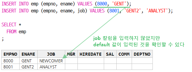 ALTER TABLE scott.emp MODIFY (job DEFAULT 'NEWCOMER') --스키마명을 붙여서 사용할 경우