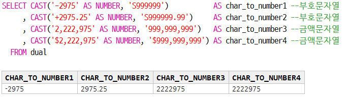 , CAST('+2975.25' AS NUMBER, 'S999999.99') AS char_to_number2 --부호문자열