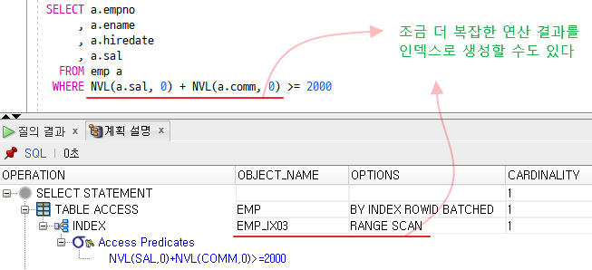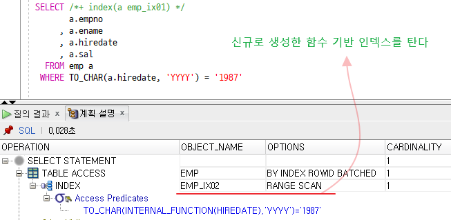 emp_ix02 함수 기반 인덱스를 생성한 후 정상적으로 인덱스를 타는 것을 확인할 수 있다.