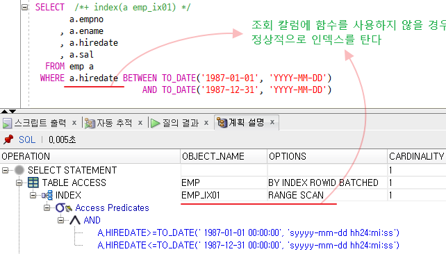 위의 예시는 인덱스의 개념을 모를 때 많이 실수하는 부분이다. ( TO_CHAR(a.hiredate, 'YYYY') = '1987 )