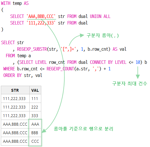, REGEXP_SUBSTR(a.str, '[^,]+', 1, b.row_cnt) AS val