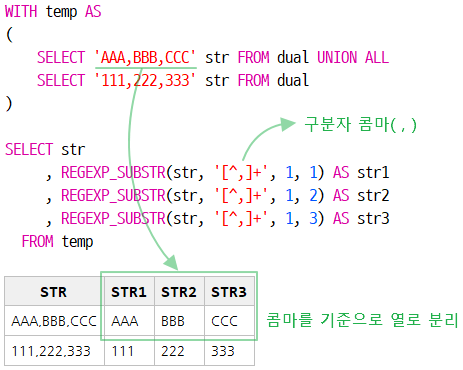 REGEXP_SUBSTR 정규식 함수를 사용하여 하나의 칼럼 값을 구분자를 기준으로 여러 개의 칼럼으로 분리할 수 있다.