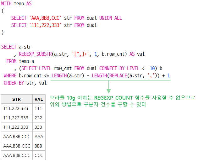 REGEXP_COUNT 함수는 오라클 11g 이상부터 사용할 수 있으며, 하위 버전에서는 아래의 방법을 사용하면 된다.