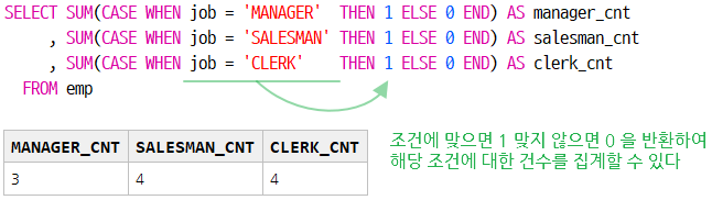 조건에 맞으면 1을 반환하고 맞지 않으면 0을 반환하여 건수를 합산할 수 있다. ELSE문 사용하지 않으면 건수가 없을 경우 NULL(공백)으로 표시할 수 있으니 상황에 맞게 ELSE 0을 빼고 사용하면 된다.