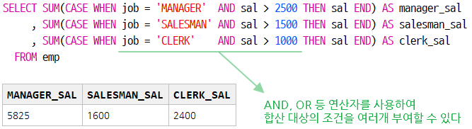 CASE WHEN의 조건을 한 개가 아니라 여러 개 부여할 수 있다. 보통 AND, OR 연산자를 많이 사용하지만 상황에 따라서 IN, LIKE, EXISTS 등 복잡한 연산자를 사용하여 조건을 부여할 수 있다.
