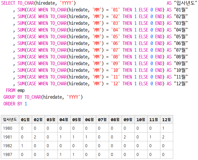 , SUM(CASE WHEN TO_CHAR(hiredate, 'MM') = '01' THEN 1 ELSE 0 END) AS "01월"