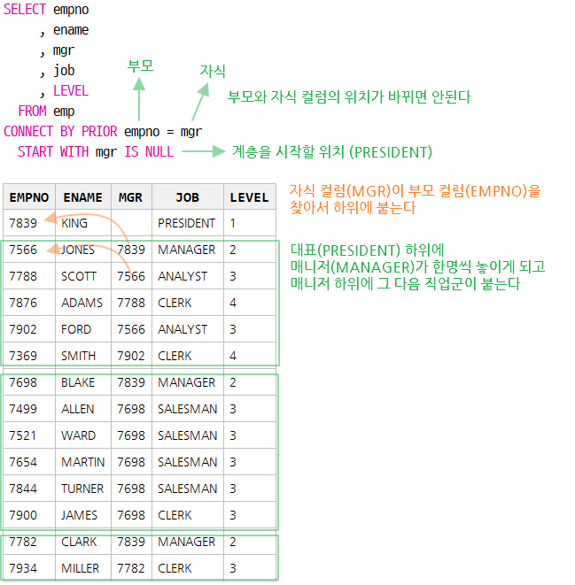 mgr IS NULL은 KING(7839)부터 계층을 시작하라는 의미이다.