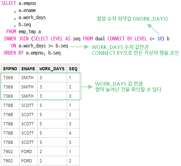 바로 위의 예제를 응용하여, 1~10까지 데이터가 있는 인라인 뷰를 만든 다음 실제 테이블의 칼럼 값과 조인하면, 칼럼의 수치 값만큼 행을 증가시킬 수 있다.