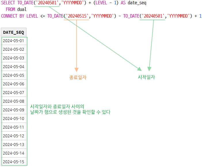 CONNECT BY LEVEL <= TO_DATE('20240515','YYYYMMDD') - TO_DATE('20240501','YYYYMMDD')+1