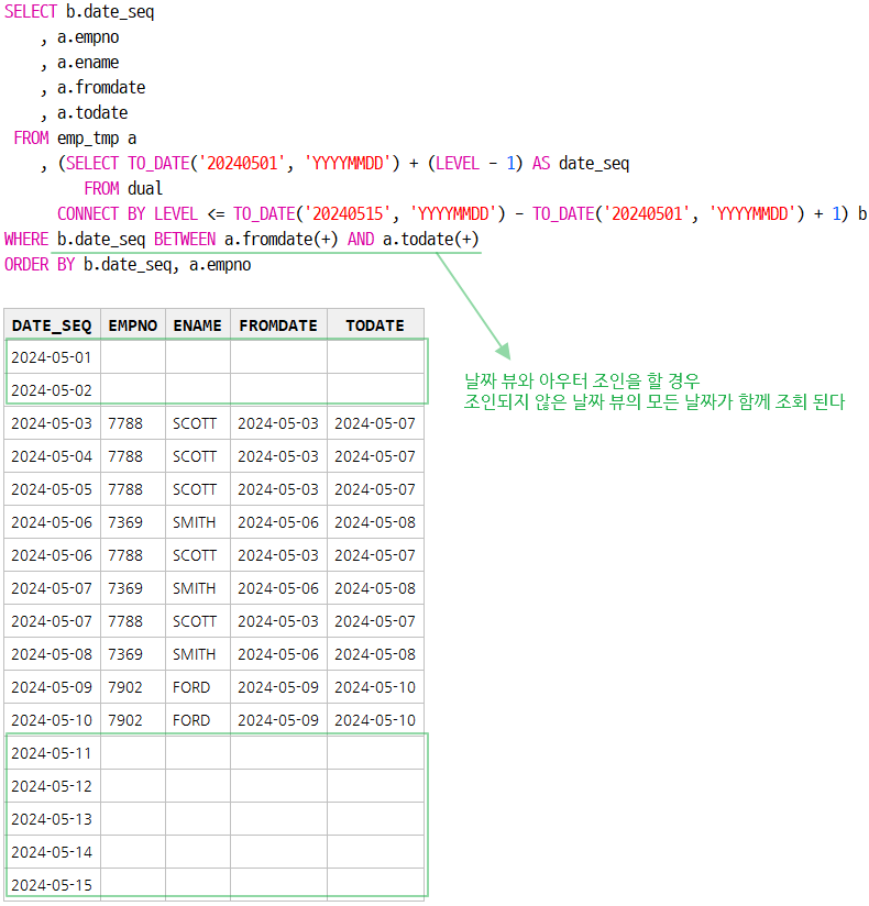 오라클에서 쿼리문을 작성하다 보면 테이블에 저장되지 않는 날짜까지 포함해서 조회해야 할 경우가 있다. 이럴 때는 시작일자와 종료일자를 설정하여 날짜 뷰를 생성하여 아우터 조인을 하면