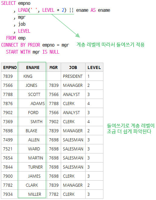 위의 결과를 보면 계층이 눈에 쉽게 보인다. 계층쿼리는 실무에서 많이 사용을 하지는 않지만 개념을 이해하고 있으면, 계층쿼리를 응용하여 쉽게 해결할 수 있는 상황이 많이 있다.